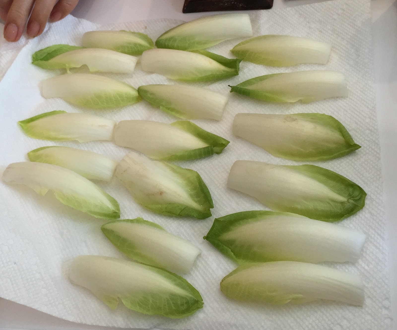 The participants are putting the stuffing on the Belgian endives. As soon as everyone put this into their mouse, everyone said, "oh, this is so good! I love this!"