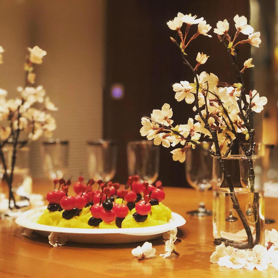 This party was a collaboration with Ms. Yuko Kanazawa who is the tea and manner consultant. She is also skilled with flower arrangement. It was a cherry blossom season, and Yuko arranged cherry flowers beautifully on the table. They were really stunning!
